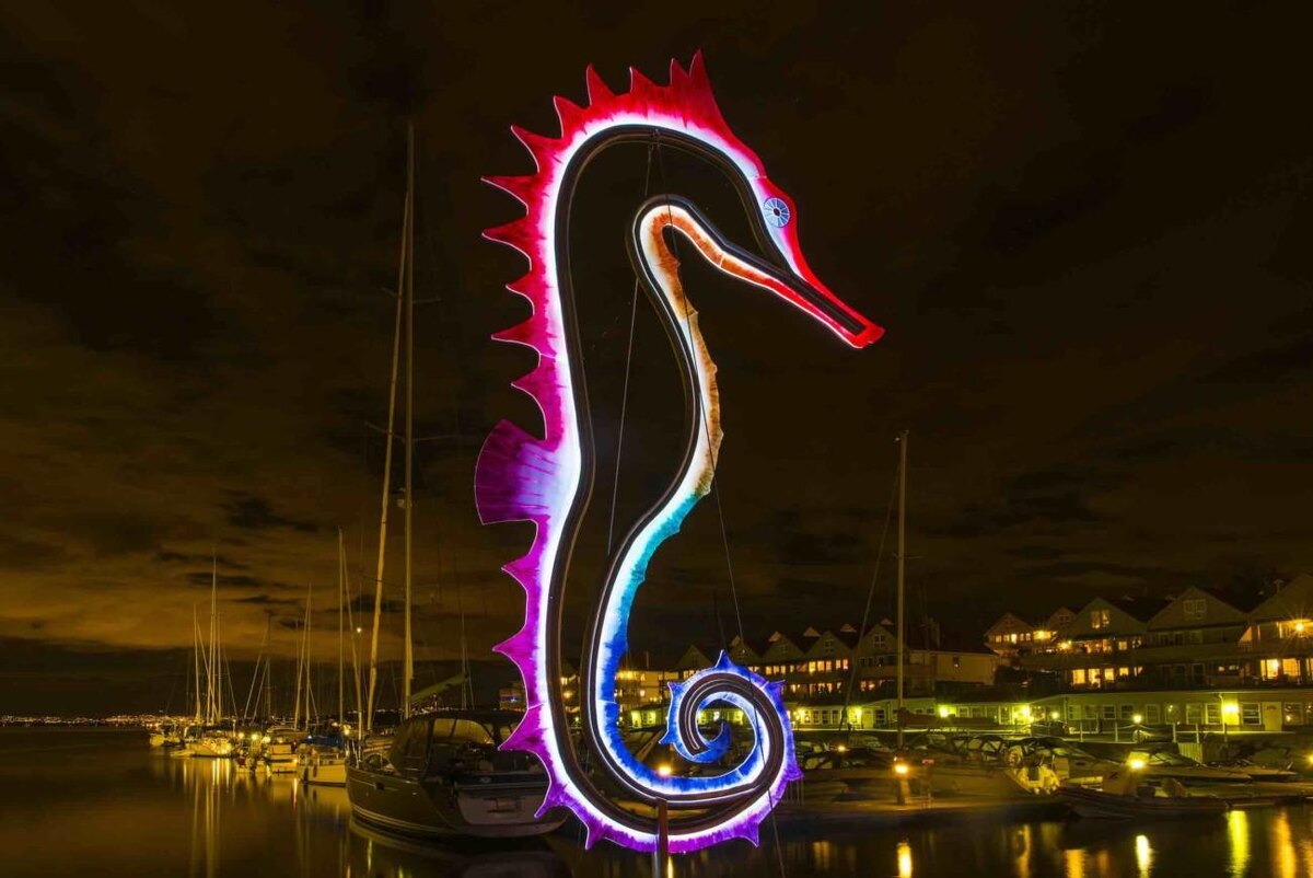 В гавани Слемместада, Норвегия, над водой парит световая скульптура высотой почти 4 метра «Sjøhesten» (что означает «Морской конек»). Скульптура создана художником-художником Калиной Панделе Иттредаль. Скульптура состоит из светодиодных лент RGBW, которые размещены между двумя слоями оргстекла и меняют цвет и цветовые сочетания в течение вечера и ночи.