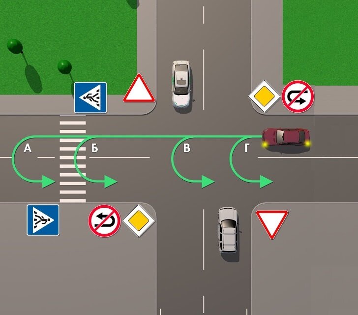 И так, как мы видим, траектория варианта Б проходит через пешеходный переход, а значит она запрещена.