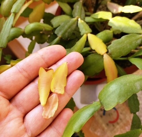 Мой кактус начал желтеть и сбрасывать «листья». На самом деле «листьями» я называю сегменты побегов, так как стебли шлюмбергеры имеют листовую форму и свешиваются вниз. Расскажу, какие ошибки я совершила, почему шлюмбергера начала желтеть.