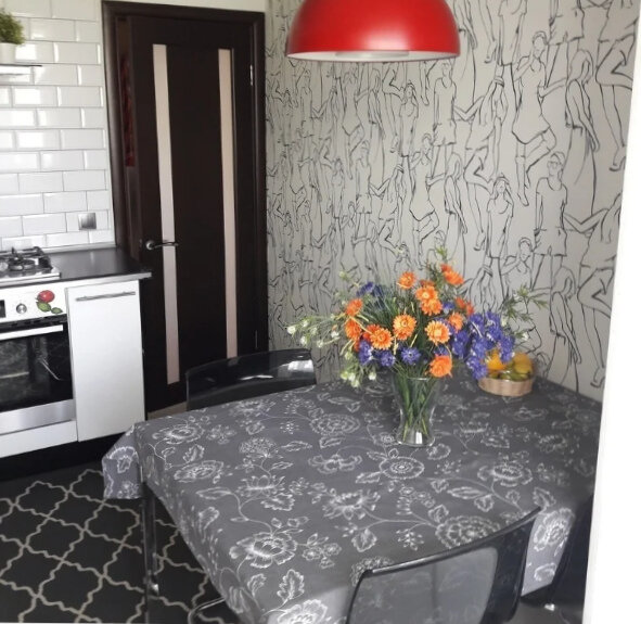 При этом обеденный стол накрыт полотенцем такого же цвета, а над ним висит красная люстра, которая стала изюминкой этой части кухни.