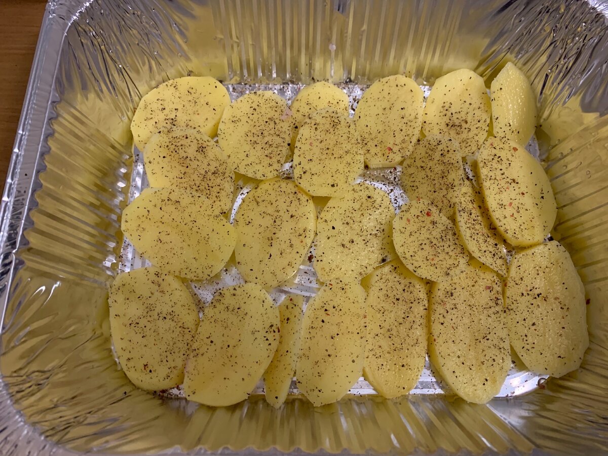 Берём форму из фольги и туда нарезаем картошку средним не очень тонкими пластинками. Поперчить , посолить.