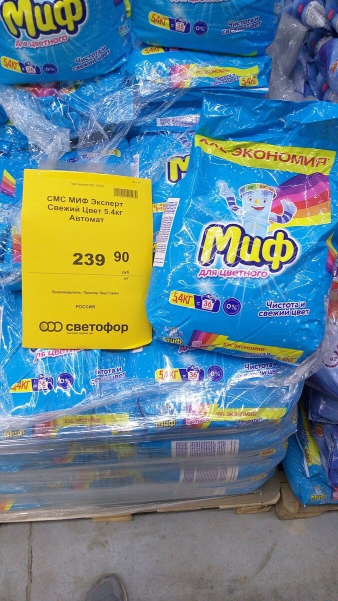 Производители некоторых товаров известные, завоз еженедельный — не магазин, а мечта каждой экономной хозяйки. Приведу всего несколько примеров: стиральный порошок «Миф» 5,4 кг всего 240 р.,