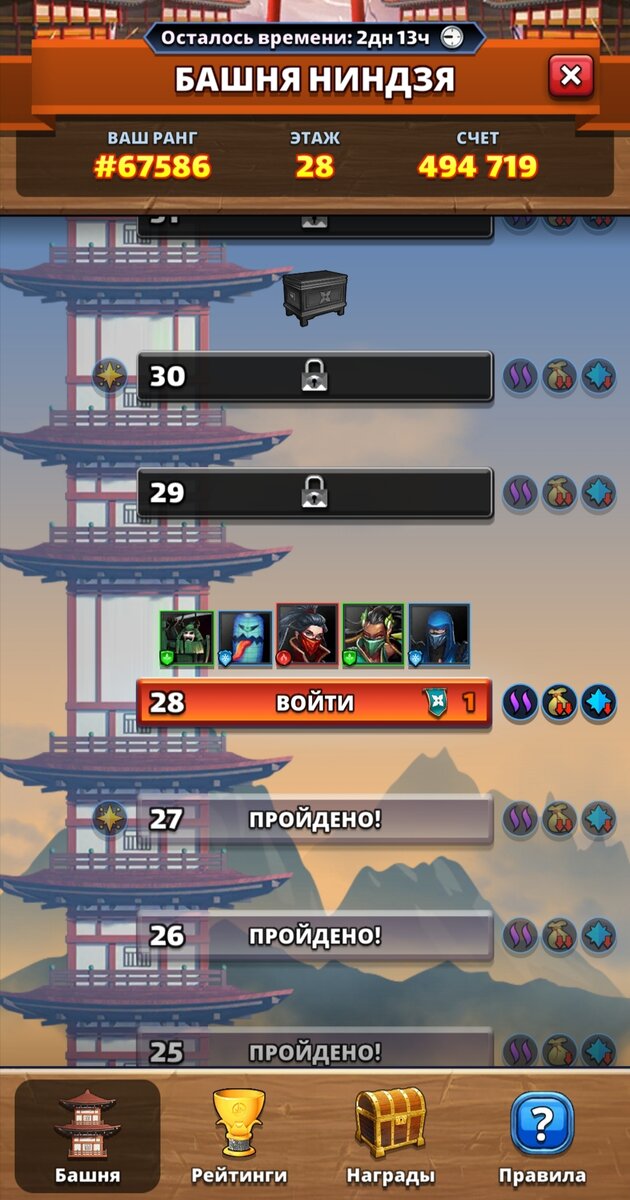 Ну что ж… Башня ниндзя — это довольно сложное мероприятие, участие твоих героев в котором надо тщательно планировать. Ну ок, не так, чтобы уж тщательно, но планировать надо. Дело в том, что в Башне ниндзя есть демоны Они, которые кидают на твоих героев проклятия. Как только герой проклят два раза, он выбывает из участия в событии до его конца. Прокляли Дерзкого Клыка — прощай хилер для красного моно. И будет у тебя вместо Дерзкого Клыка в команде сидеть Хокмун.