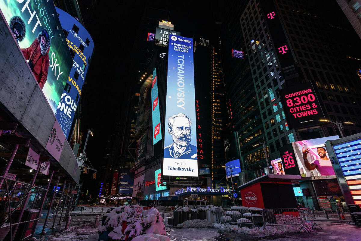 Гигантский билборд Spotify с изображением Петра Чайковского разместили на Таймс-сквер в пятницу.