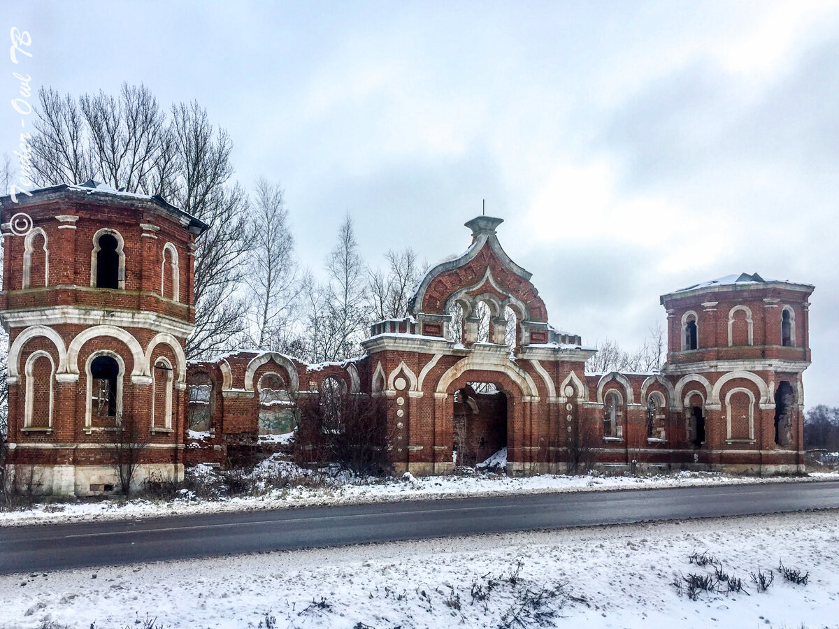 Самый яркий по архитектуре корпус расположен на обочине шоссе. Это здание красного кирпича с нарядной отделкой белого камня. Сейчас уже сложно предположить его назначение: гостевой дом, служебное здание или величественная входная группа? Вряд ли возможно узнать наверняка.
