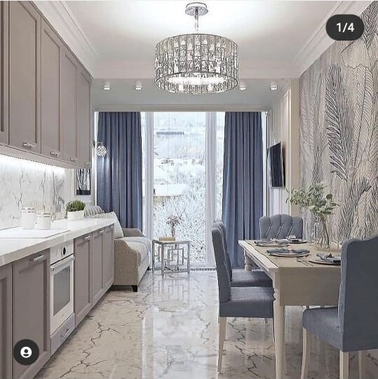 Дизайн этой кухни часто попадался мне в Инстаграм. Я знаю, что он многим полюбился из-за сочетания цветов и наличию зоны релакс с диваном. Давайте же разберем и найдем товары, которые помогут нам воссоздать этот интерьер.