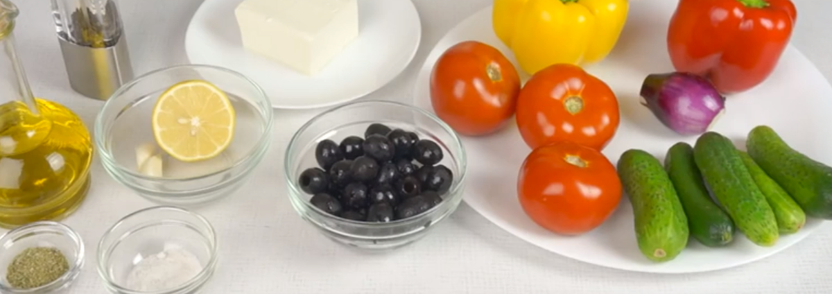 Нам понадобятся: болгарский перец - 2 шт; огурцы - 5 шт; помидоры - 3 шт; красный лук - 1/2 часть; сыр фета - 150 гр; оливки; чеснок - 2 зубчика; лимонный сок - 1 ст.л.; соль; орегано; оливковое масло - 4 ст.л; черный молотый перец Нарезаем овощи крупными кусками, складываем в миску и перемешиваем. Затем выкладываем в тарелку, в которой будем подавать на стол. Половину луковицы нарезаем полукольцами и выкладываем на наш салат. Готовим заправку. Выдавливаем через пресс чеснок. Солим по вкусу. Выдавливаем лимонный сок. Добавляем оливковое масло и черный молотый перец. Все хорошенько перемешиваем и равномерно поливаем салат. Сыр фета нарезаем кубиками. Выкладываем на салат. Сверху посыпаем сушеным или свежим орегано (душицей). Если нет орегано, его может заменить майоран. Заключительный штрих - украшаем салат оливками. С этим салатом можно экспериментировать. Например, если нет сыра фета, его вполне можно заменить обычной брынзой. Приятного аппетита! Поставьте, пожалуйста, ЛАЙК!