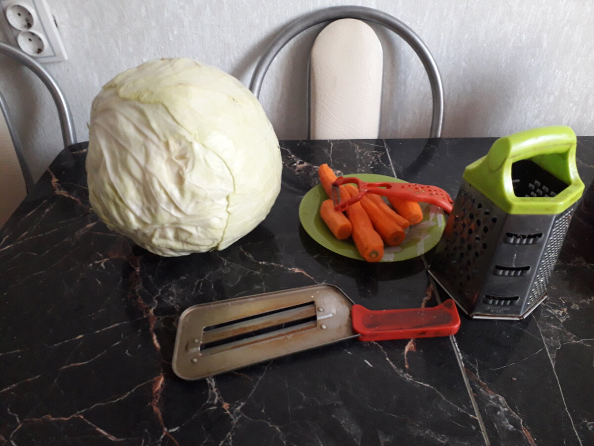 Далее подготавливаю качан капусты, обрезав все поврежденные листья. Капусту я шинкую на столе специальным ножом, морковь - на шинковка.