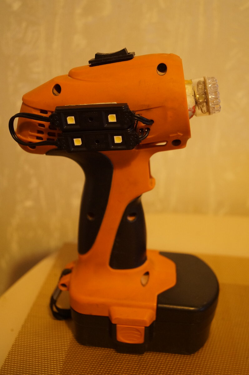 Если вы самостоятельно занимаетесь ремонтом автомобиля, вам наверняка пригодится моя самоделка из старого шуруповёрта. Достоинства его неоспоримы: это длительная работа на полностью заряженном аккумуляторе, быстрая замена аккумулятора, возможность напольной установки, так же возможность его подвесить, прикрутив кусок проволоки. Для самоделки нам понадобится: - корпус от шуруповёрта -светодиодный модуль на 14 вольт - лампочка на 14 вольт - переключатель с тремя положениями - пластилин -кусок стеклотекстолита, материала для плат - лобзик электрический -провод длиной 1 м -суперклей -мультиметр Из текстолита вырезаем круг диаметром так, чтобы он ровно вошёл в корпус со стороны, где была головка со сверлом. В центре вырезаем отверстие под основную лампу. Ставим лампу, зазор между текстолитом и лампой замазываем пластилином. Мультиметром определяем как паять провода к переключателю положение 1 и положение 2. Крепим на двусторонний скотч LED модуль на корпус шурупов