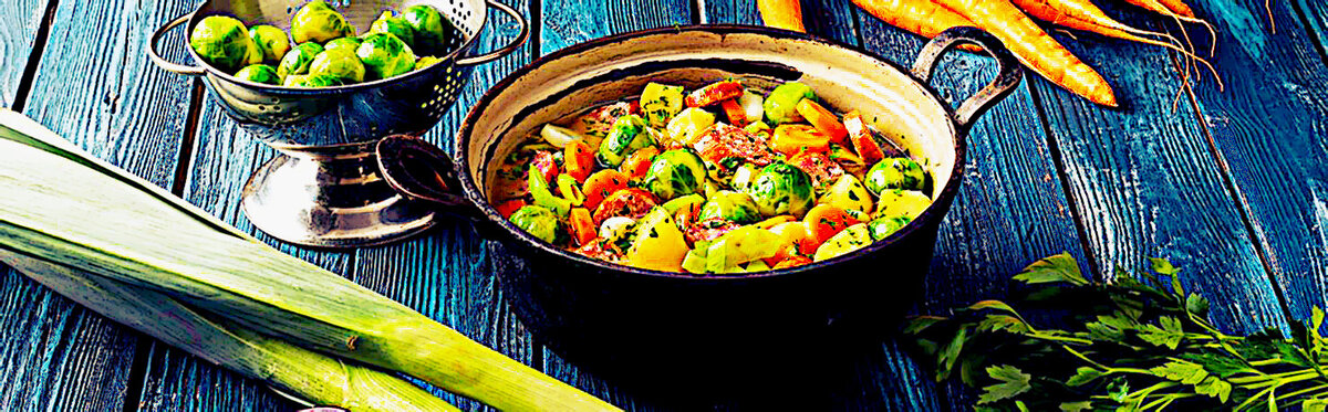 Мы подготовили рецепт красочного рагу с капустой и свиными купатами. В данном рецепте капуста отлично сочетается с сардельками и картофелем, а углеводы обеспечат вам ощущение сытости на долгое время. Ингредиенты: - 600 г картофеля - 300 г моркови -500 г брюссельской капусты - 1 стебель лука-порей - 2 луковицы - 1 ст.л. оливкового масла - 1 л овощного бульона - 200 г купат, можно колбасы полукопченой казачьей - 2 лавровых листа - 4 стебля (ов) тимьяна - 0,5 пучка петрушки - сметана - соль, перец по вкусу Способ приготовления: 1. Очистите картофель, вымойте и нарежьте мелкими кусочками. Очистите и порежьте морковь. Очистите и вымойте брюссельскую капусту. Очистите лук-порей, вымойте и нарежьте кольцами. Порежьте лук. 2. Разогрейте масло в сковороде и обжарите лук. Добавьте картофель, морковь, брюссельскую капусту и лук-порей и слегка обжарьте. 3. В кастрюле вскипятите бульон. Выложите в него обжаренные овощи. 4. Нарежьте готовые на гриле купаты и добавьте с лавро
