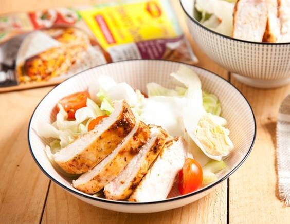 Куриные грудки нарезать полосками, выложить сверху на салат. Украсить салат разрезанными на четвертинки отварными яйцами и шариками мини-моцареллы. Полить заправкой. Вкусный и полезный салат готов! Приятного аппетита!