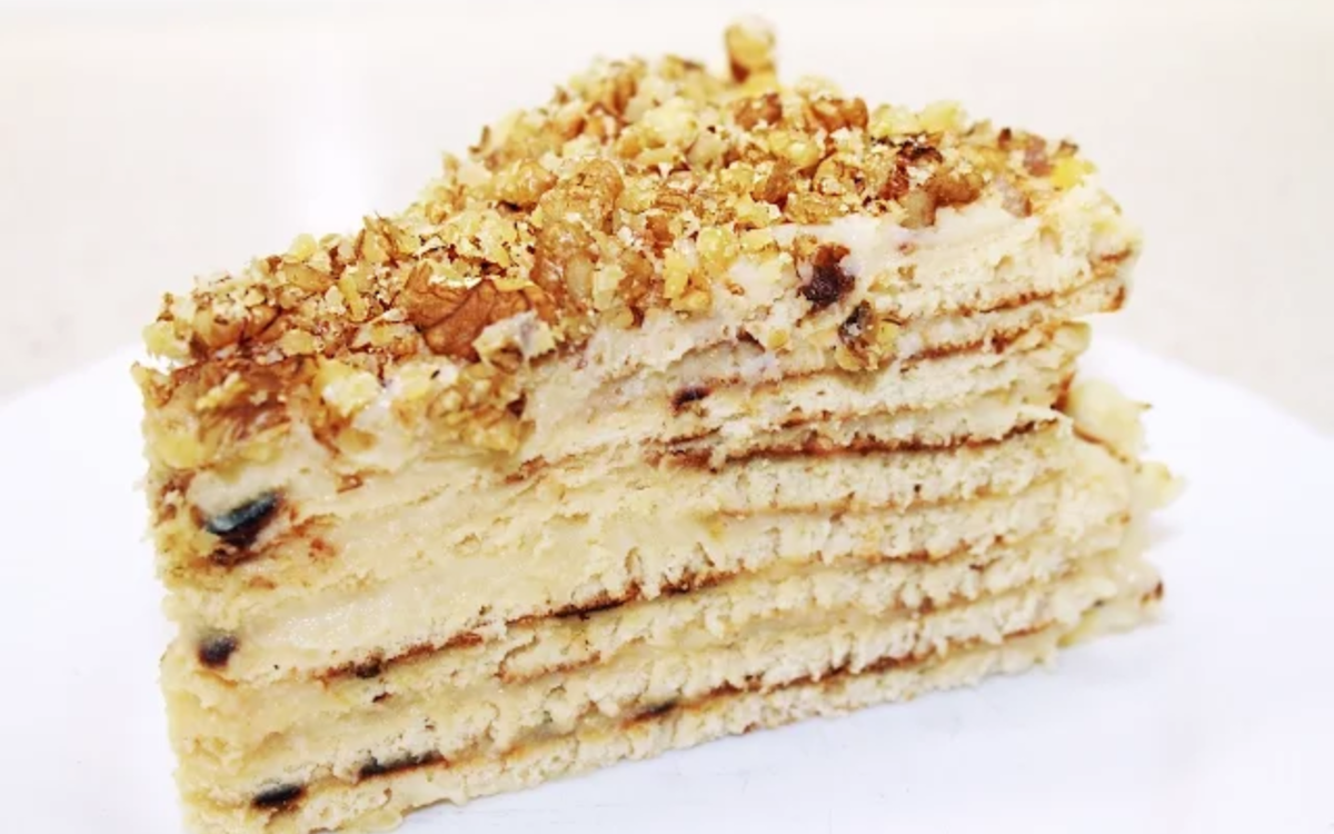На среднем огне на одной стороне корж находится минуту, на другой пол минуты. Далее каждый корж смазываем кремом.