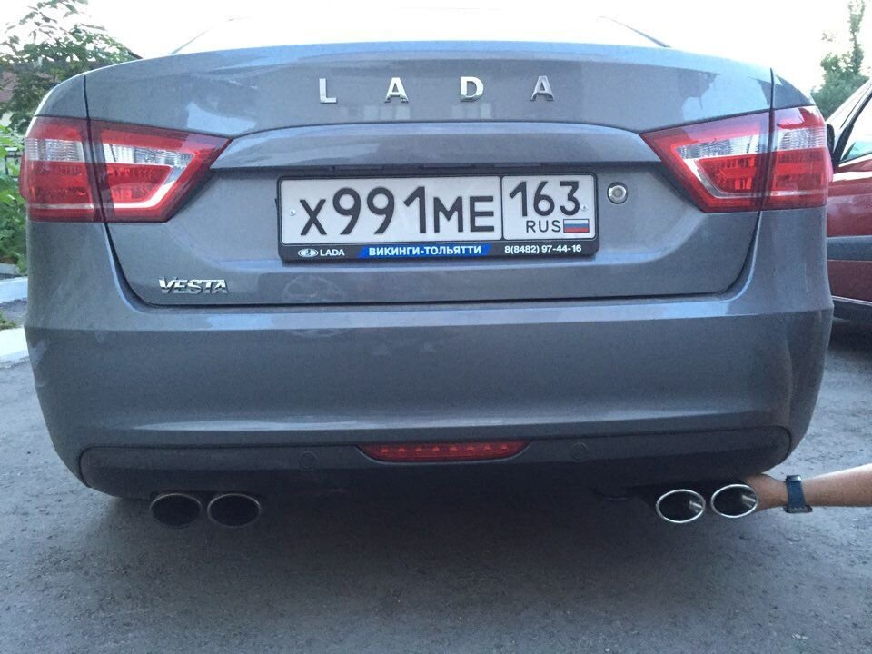 Развести на две стороны выхлоп на Весте, возможность есть, пространство под машиной предостаточно. Мне показалось, что сам автомобиль узкий, и при раздвоении, насадки слишком близко друг к другу. На фото имитация, на мой взгляд выглядит приторно)) Но как говорится — на вкус и цвет…