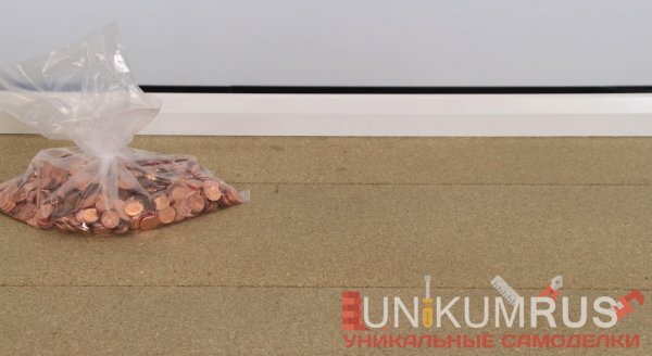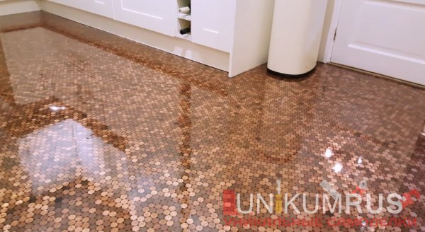 два ведра, мешок с монетами, защитные перчатки и очки. Шаг первый На первом этапе нужно привести пол в порядок удалить пыль, грязь, при необходимости выровнять по уровню. Шаг второй Теперь нужно выложить пол монетами. Монеты нужно зафиксировать на силикон. На пол наносится полоска силикона, сверху приклеивается монета. И так ряд за рядом. Шаг третий Швы между монетами затираем черной затиркой для плитки. Вытираем верхнюю часть монет. После высыхания затирки, нужно еще раз протереть пол и пропылесосить. Шаг четвертый Теперь рассчитаем нужное количество эпоксидной смолы. Для пола нуж