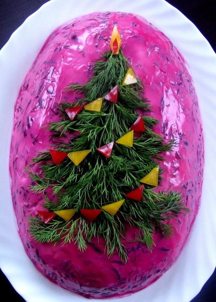 "Сельдь под шубой" - один из традиционных салатов на новогоднем столе в русскоговорящих странах. Салаты из ингредиентов, типичных для селёдки под шубой, были распространены в первой половине 19-го века в скандинавской и немецкой кухнях под названием «селёдочный салат» (Sillsallad, Sildesalat). Английская поваренная книга 1845 года содержала рецепт шведского селёдочного салата, состоящего из норвежской сельди, уложенной на дно блюда, и покрытой резаной свёклой, картофелем, пикулями, тёртым яблоком и рублеными яйцами. Норвежский рецепт 1851-го года (Lærebog i de forskjellige Grene af Huusholdningen, s. 351, см. датскую статью Sildesalat) предлагал для этого салата уложить селёдку на дно блюда, а сверху разложить свёклу, морковь, яйца и другие ингредиенты не перемешивая. Для русских и других северо-европейских поваренных книг второй половины 19-го века типичны и рецепты салатов со стандартным для селёдки под шубой (и винегрета с селёдкой) набором ингредиентов: сельдь, картофель, свёкла,