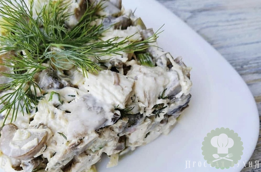 Предыдущий рецепт салата с корейской морковкой стал настоящей звездой этого канала, собрав огромное количество лайков. Спасибо Вам за такую активность. Сегодня я хочу поделится с вами еще одним рецептом салата к новогоднему столу. Он тоже очень простой в приготовлении и потрясающе вкусный. Первоначально салат был слоенный, но как то раз я решил просто смешать все ингредиенты, и не возится со слоями)). Такой вариант мне понравился больше, все ингредиенты отдали свой вкус и получился очень классный салат, гости оценили его по достоинству. Ингредиенты: 300 гр. шампиньонов 400 гр. куриной грудки 150 гр. соленых огурчиков зелень по вкусу (я использую укроп) майонез или сметана соль по вкусу (учтите что огурчики соленые и майонез тоже, так что соль может и не понадобится) Приготовление: 1. Грибы нарезаем и обжариваем до готовности. Куриное филе отвариваем и нарезаем кубиками. 2. Огурчики тоже режем кубиками и перемешиваем все ингредиенты. 3. Добавляем мелко нарезанную зелень и майонез. Еще