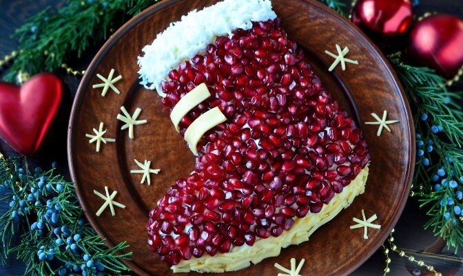 Праздник уже скоро, пора планировать новогоднее меню. Как Вам такой салатик? Рецепт Салат с курицей «Валенок» на Новый год Ингредиенты: Филе куриное – 200 г Сыр твердый – 100 г Яйца – 2 шт. Лук репчатый красный – 0,5 шт. Гранат (крупный) – 0,5 шт. Майонез – 100 г Сахар – 1 ч. л. Соль - по вкусу Перец черный молотый - по вкусу Приготовление: Для начала в заранее подсоленной воде отварим филе курицы до полной готовности. Куриные яйца варим вкрутую (около двенадцати минут). Лук мелко нарезаем и выкладываем в миску небольшого размера, добавив туда немного перца. Заливаем нарезанный лук горячей водой и оставляем настояться минут на десять. Твёрдый сыр крупно натираем на тёрке. Остывшие сваренные яйца очищаем от скорлупы и так же крупно натираем. Один белок отделяем от желтка, натираем и оставляем для украшения салата. Филе курицы режем на одинаковые куски среднего размера. Лук, залитый водой, вынимаем, отжимаем и перемешиваем с тёртым сыром и яйцами, добавляем туда же нарезанную курицу