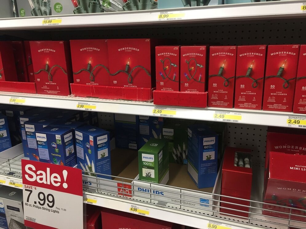 Перед Рождеством в любом, самом обычном продуктовом магазине в Америке можно купить ёлочные гирлянды. 50 фонариков в гирлянде — 2.49 $, на 100 — 2.99 $. Фонарики от бренда Philips по акции — 7.99 $ за 100 лампочек, с экономией 4 $. Гирлянды от того же Philips на 200 лампочек в гирлянде — 15.99 $, на 100 — 8.99 $. С разными характеристиками: на любой вкус и цвет. А в такси Uber некоторые водители радуют своих клиентов мятными карамельными тростями (анг. candy cane).