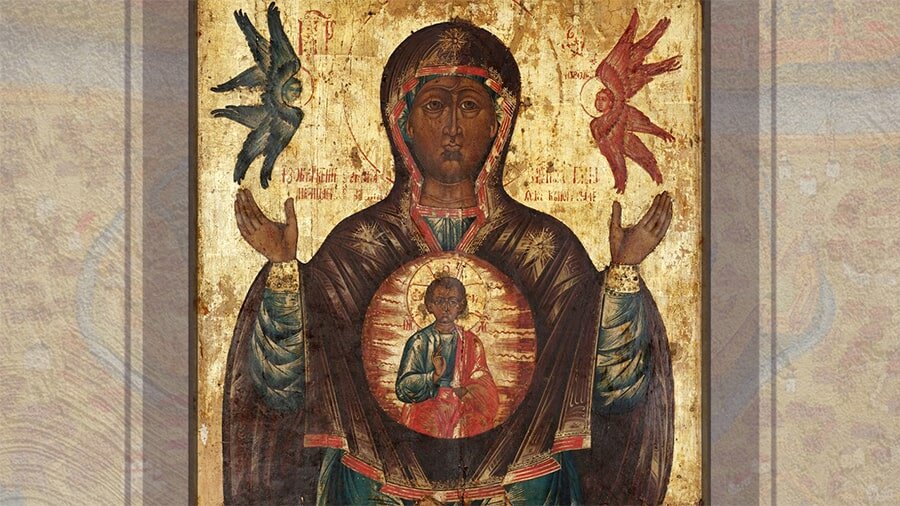 Этот образ выделяется среди многочисленных икон, посвященных Пречистой Деве Марии. Чаще всего округлой формы, икона «Знамение» изображает Богородицу с воздетыми к небу руками, на груди Которой в медальоне или щите написан Иисус Христос. Поза Девы Марии являет собой молитвенный жест. Еще в древности, согласно записям Тертуллиана, христиане воздевали и распростирали руки. Это было подражанием Страстям Господним. Таким образом Богородица также являет и Свое заступничество за людей пред Богом. Икона «Знамение» относится к весьма древнему иконописному типу, это один из самых первых образов Божией Матери. Одна из схожих икон — византийская «Никопея» — датирована IV веком. На ней Дева Мария изображена сидящей на троне, двумя руками Она держит перед собой щит овальной формы с образом Спаса Эммануила. На Руси икона «Знамение» распространилась в XI–XII веках. …На Великий Новгород двинулся неприятель. Однако это были не заморские воины или вражеские иноверцы. Под стенами могущественно