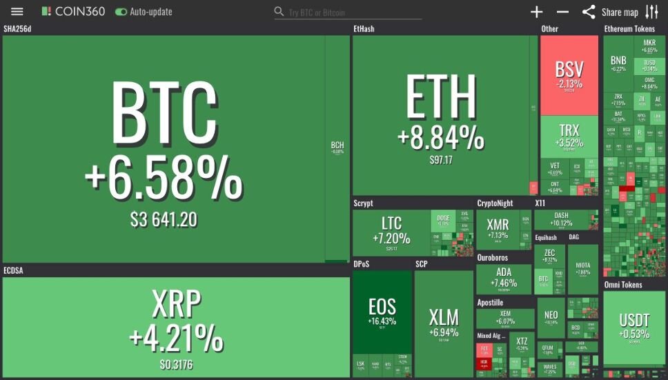 Платформа Trader trends (tt.ff.ru) – сервис решений для трейдеров и держателей криптоактивов. Подключайся и следи за портфелями профессиональных трейдеров. Воскресенье, 9 декабря: на крипторынках появляется волна зеленого, так как биткоин (BTC) торгуется ближе к $3,700 в конце недели по данным Coin360. После недели прорыва выше новогодних минимумов основная криптовалюта торгуется на отметке $3,650 на момент написания статьи, увеличившись более чем на 7% за 24-часовой период. Монета по-прежнему снижается почти на 9% за неделю и более чем на 44% за месяц согласно индексу цен биткоина Cointelegraph. Вторая по рыночной капитализации криптовалюта, Ripple (XRP), также выросла на 5% за день, торгуясь на уровне $0.31 по состоянию на момент написания статьи согласно индексу цен Ripple Cointelegraph. Недельные и месячные графики Ripple похожи на графики биткоина с потерями почти в 12% и 41% соответственно. Трет