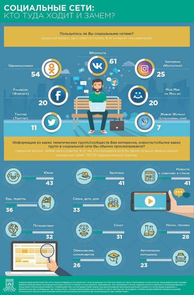 ВКонтакте и Одноклассники среди социальных сетей, предложенных для оценки, являются самыми часто посещаемыми: так 42% российских интернет-пользователей практически ежедневно пользуются ВКонтакте(в молодежных группах – 78% среди 18-24-летних, 54% среди 25-34-летних), 27% - Одноклассниками (среди 60-летних и старше – 40%). Всего же на соответствующие ресурсы заходят 61% и 54% опрошенных интернетчиков. Instagram с той или иной периодичностью просматривают 25%, страницы Facebook и Моего мира листают 20%. Twitter и Livejournal наименее популярны: ими пользуются 11% и 7%, соответственно. Наиболее востребованными в социальных сетях тематическими сообществами и группами являются юмористические (их просматривают 43%), связанные со здоровьем (41%), новости о событиях в стране (41%). Также интересны страницы о еде и кулинарии (36%), о доме и семье (33%), путешествиях (32%), спорте (31%), науке и технике (28%). Реже всего листают страницы территориальных, профессиональных и учебных сообществ (