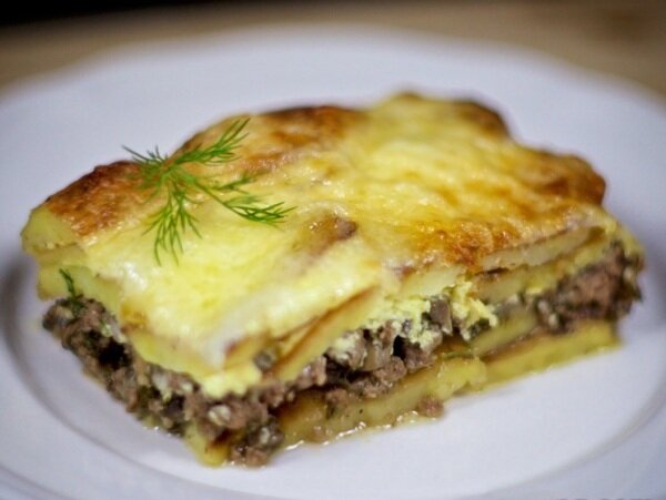 Нам понадобится: Картофель 8 штук Фарш 400 грамм Грибы 150 грамм Лук репчатый 2 штуки Сметана 200 грамм Яйцо 1 штука Чеснок 2 зубчика Соль, перец по вкусу Способ приготовления: В смазанную маслом форму для запекания выкладываем картофель нарезанный кружочками, солим, перчим и на картофель кладем лук репчатый нарезанный полукольцами, на лук кладем фарш, затем нарезанные грибы. На грибы трем половину нормы сыра. Затем на сыр выкладываем оставшийся нарезанный кружочками картофель снова солим и перчим и заливаем заправкой, сделанной из сметаны, чеснока и яйца. Затем ставим в духовку и запекаем 1 час, за 5 минут до готовности запеканку посыпаем оставшимся тертым сыром . Приятного аппетита друзья! Оцените лайком и подписывайтесь на мой канал.