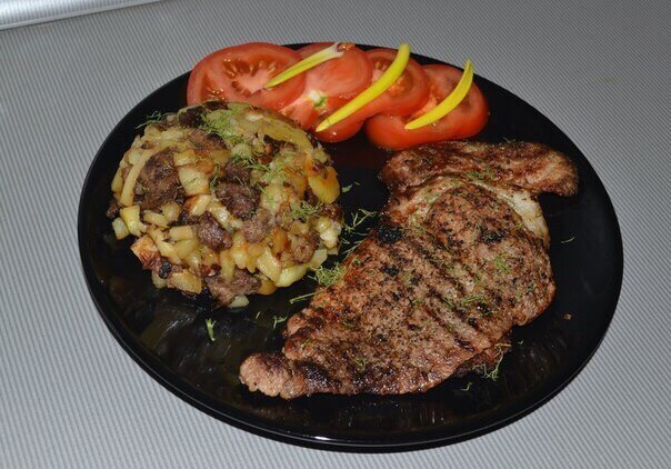 Стейк со свининой, вымоченный в молоке с гарниром из белых грибов и картофеля