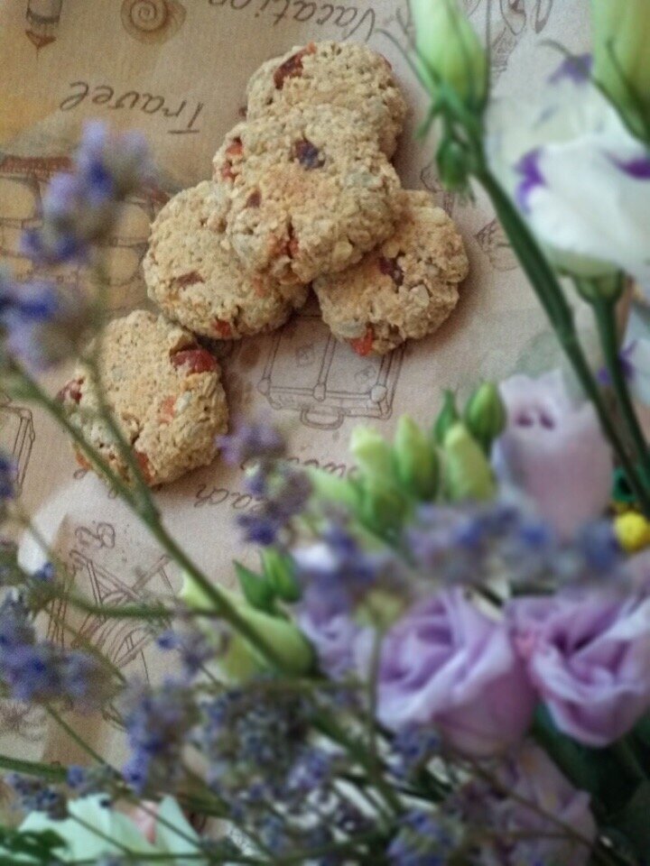 Ингредиенты: 260 гр овсянки быстрого приготовления 2 ст.л. овсяной муки или измельченной в блендере овсянки (что одно и то же) 0.5 ч.л. соли 100 гр мелко порезанной кураги 60 гр семечек 1 ч.л. корицы Цедра 1 апельсина (можно без нее) 100 мл воды 100 мл раст.масла Технология приготовления: Включаем духовку на 220 градусов, пусть хорошенько нагреется, пока готовим тесто. Все ингредиенты выкладываем в миску, перемешиваем вилкой и оставляем минут на 5-10. За это время овсянка размягчится . Потом хорошенько вымешиваем тесто рукой, тоже минут 5. Тогда оно станет плотным, и печенье после выпекания не будут крошиться. Отсчипываем тесто, крутим шарики, выкладываем их на силиконовый коврик или пергамент. Когда все шарики готовы, начинаем их немного расплющивать ладонью. Отправляем на верхний уровень духовки на 10-15 мин. Через 10 мин можно их перевернуть и готовить ещё 5 минут.