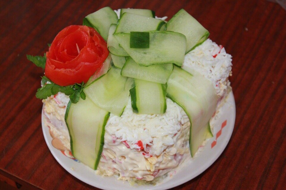 Ингредиенты: Крабовые палочки Яйца Маринованные огурцы Помидоры Чеснок Свежий огурец Петрушка Картофель Лук репчатый или шалот Растительное масло Горчица Соль Технология приготовления: Сделаем соус: в чашу блендера вливаем 2 желтка сырые, начинаем взбивать добавляя тонкой струей растительное масло, горчицу и солим, взбиваем до консистенции густой сметаны. Для салата: яйца отвариваем, картофель промываем и отвариваем в кожуре. Маринованные огурцы мелко мелко режем на квадратики, крабовые палочки или крабовое мясо тоже нарезкам мелким квадратом, яйца и картофель рубим одинаковым размером с остальными ингредиентами. Лук мелко шинкуем, так что бы он был меньшего размера чем все остальные продукты, он придаёт сочность салату. Помидоры удаляем от водянистой части и тоже режем мелким кубиком, чеснок пропускаем через пресс или натекаем на мелкой терке и добавляем в салат. Все ингредиенты перемешиваем и заправляем соусом. Придаём форму квадрата на блюде и украшаем. Для украшения ну