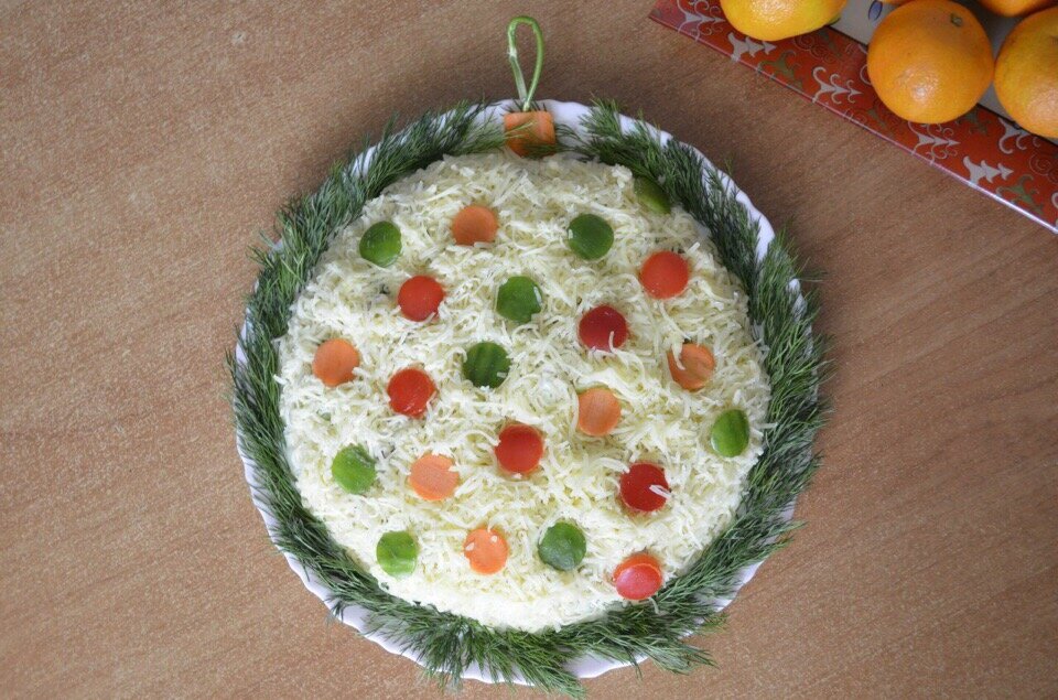 Ингредиенты: Ветчина или молочная вареная колбаса Сыр твёрдый любой Сыр творожный Огурец свежий Яйца Укроп Болгарский перец для украшения разных цветов Картофель Оливки Йогурт натуральный Соль Ананасы консервированные Технология приготовления: Ветчину нарезать мелкой соломкой, огурец тоже порезать соломкой предварительно отчистить от семян и водянистой части, это можно сделать чайной ложкой разрезав огурец пополам вдоль. Яйца отварить, почистить и натереть на мелкой терке. Картофель отварить, почистить и нарезать мелким кубиком. Оливки порезать произвольно. Ананасы порешить мелким кубиком. Сыр натереть на крупной терке. Соединить все ингредиенты и заправить йогуртом, творожным сыром и перемешать. Выложить на блюдо в форме шара и украсить. Для украшения нам нужно их болгарского перца разных цветов, помидора, огурца и редиски вырезать шары это можно сделать специальной ложкой или просто ножом, или формочкой любой, может взять крышки. Выложить на салат натертые на мелкой тер