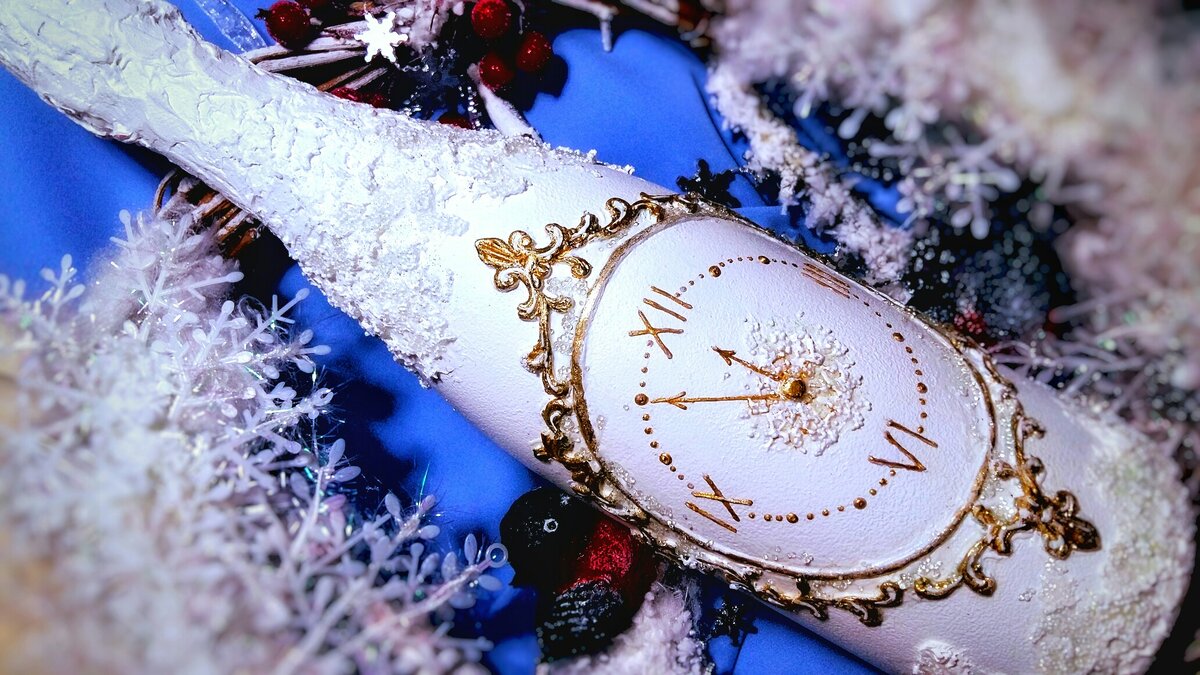 Оформление праздничной и нарядной бутылки шампанского, имитация лепнины и позолота. Такая бутылочка станет отличным украшением новогоднего стола, а также необычным подарком для близких!