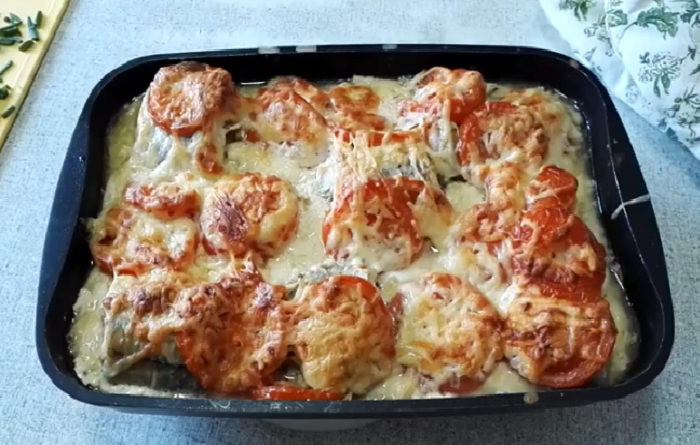 Просто, быстро и очень вкусно! На все про все у вас уйдет примерно пол часа и горячий, вкусный, а главное полезный обед у вас на столе! Подавать запеченную рыбку можно со всем чем угодно, мне очень нравится с картофельным пюре. Но когда времени на приготовления картошки не хватает, то я вполне обхожусь просто хлебом и рыбой) Еще могу под это дело по-быстрому нарубить салатец из овощей, получается и сытно и в то же время легко. Так что после обеда даже не возникает желания покимарить час-другой, а наоборот, ощущается прилив сил и энергии) Итак, нам понадобится: около килограмма минтая 2-3 помидора пара средних луковиц несколько зубчиков чеснока - по вкусу 200 грамм сметаны грамм 100 твердого сыра небольшой пучок любой зелени соль, перец, специи для рыбы - по вкусу немного подсолнечного масла. Рецепты вкусных блюд из рыбы еще можно посмотреть тут: Красная рыба в духовке под сливочным соусом - царское блюдо на праздничный стол Минтай "в шапке" из овощей - готовим вкусно в духовке