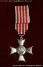 Ганзейский крест города Бремена за заслуги в войне 1914 – 1918 гг. Оригинальное название на немецком языке Hanseatenkreuz. Крест был учрежден 14 сентября 1915 года. Производственный выпуск до 1919 года. Германия. Награждались граждане города, военные, а также гражданские лица, за боевые заслуги или оказанную помощь в период 1 Мировой войны (1914-1918 гг.). Кроме того, знаком отличия могли награждаться и не граждане вольного города Бремена. Оригинал, подлинник. Общее количество награжденных около 20.000 тысяч человек. Статус награды: устаревшая (не вручается). Материал и техника изготовления: цветной металл, серебрение, эмаль, литье, пайка, волочение, ткань, шитье. Состояние: хорошее, небольшие потертости как с лицевой, так и с оборотной стороны, незначительная реставрация по эмали. Размеры: с учетом крепежного ушка – 43 х 40 мм. Описание креста: выполнен в форме равноконечного креста, с ушком, промежуточными кольцами и лентой. Аверс: в сердцевине гербовое изображение ганзейского воль