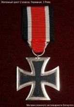 Железный крест 2 класса образца 1939 года. Оригинальное название на немецком языке; Eiserne Kreuz. Германия, 3 Рейх. Оригинал, подлинник. Статус награды: устаревшая (не вручается). Материал изготовления: железо, серебро, ткань, олово, черная краска. Техника изготовления: штамп, окрашивание, шитье, пайка. Общий размер: без учета ушка – 44 х 44 мм. Состояние: хорошее, незначительная утрата краски на лицевой части награды. Аверс: изображение равноконечного креста шварцкройцкого типа, по центру сердцевины свастика, в поле нижнего луча даты учреждения образца 1939 год. Кант (рамка) изготовлен из серебра, поле изготовлено и выкрашено в черный цвет. Какие – либо клейма отсутствуют. Реверс: в нижнем луче даты учреждения награды — 1813 год. Железный крест учрежден королем Пруссии (на тот момент самое большое территориальное образование на территории Германии) и инициатором воззвания к немецкому народу Фридрихом Вильгельмом III (1797 — 1840 гг.) 10 марта 1913 года в память освободительной войн