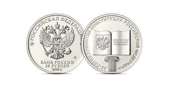 10 декабря Центральный Банк РФ выпустил в обращение новую памятную монету из недрагоценного металла, посвященную 25-летию принятия Конституции Российской Федерации. Данная монета оказалась весьма ожидаемой коллекционерами, так как ее выпуск был внесен в планы ЦБ РФ не более месяца назад. Это создало определенный ажиотаж и интерес у нумизматов. Монета выполнена на стандартной заготовке для 25-рублевых монет и датирована 2018 годом. На реверсе монеты, размещено изображение, полностью аналогичное тому, что было размещено на монете номиналом 10 рублей. То есть, монета содержит изображение раскрытой книги на капители. На левой странице книги изображен Государственный герб Российской Федерации, на правой странице – присутствует надпись в три строки «КОНСТИТУЦИЯ РОССИЙСКОЙ ФЕДЕРАЦИИ». Различие составляет лишь надпись по окружности: «25-ЛЕТИЕ ПРИНЯТИЯ КОНСТИТУЦИИ РОССИЙСКОЙ ФЕДЕРАЦИИ». В плане выпуска памятных монет на 2018 год указано, что данная монета планируется к выпуску в количестве