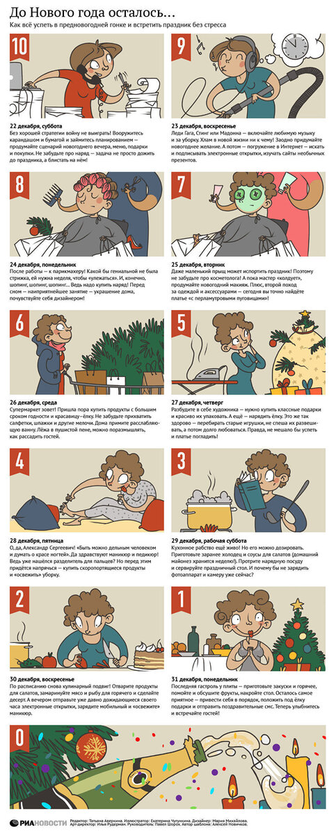 Не нужно перелопачивать груды книг по тайм-менеджменту, чтобы успешно справиться с новогодними хлопотами. Специально для тех, кому "все время некогда", РИА Новости разработало инструкцию по подготовке к празднику. Все успеть до Нового года можно! Главное — отказаться от наполеоновских планов (Дед Мороз с вас не спросит) и прекратить раздавать невыполнимые обещания. Нагрузка в конце года и так большая! Другой важный момент — не суетиться. Это иллюзия, что гиперактивность повышает КПД.