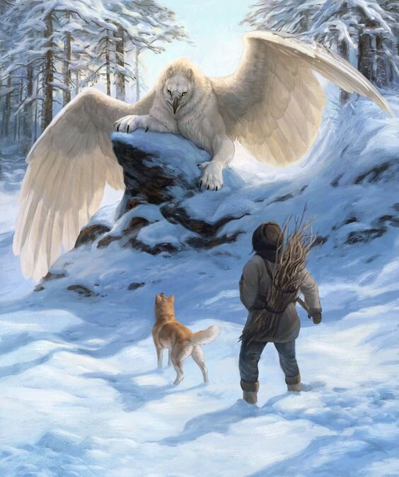 Наступила зима.. В горах она приходит раньше, чем в лесу.. Снег улёгся толстым покрывалом не только на самых вершинах гор, как летом, но и в долине, где стоял старый кряжистый дуб.. Он теперь был весь белый от, навалившего на него, снега, переливающегося всеми цветами радуги в лучах восходящего солнца.. Дупло завалило почти полностью, из-под сугроба выглядывала лишь верхняя его часть.. Никаких следов, ни звериных, ни птичьих нигде не было.. Девственно ровное и серебристо-белое снежное покрывало.. Никого во всей долине.. Ни души.. *** В горную долину вышел человек, на его спине висел арбалет и небольшая вязанка хвороста.. Рядом бежал пёс, принюхиваясь к незнакомой местности.. Давно уже не захаживали сюда люди, тем более зимой.. Что ему здесь понадобилось?? Видимо, совсем в лесах перевелось зверьё.. А, может, оно всё ушло из-за массовых пожаров, что бушевали летом на громадной территории?! Вдруг, пёс остановился, принюхался и встал в стойку, показывая хозяину, что нашёл-таки еду.. На