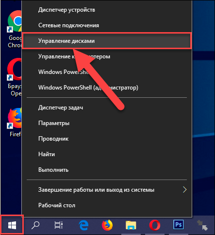 Способ первый: Найдите в нижнем левом углу рабочего стола на «Панели задач» кнопку «Пуск». Щелкните по ней правой кнопкой мыши или нажмите вместе сочетание клавиш «Windows + X» и откройте всплывающее меню. В списке доступных приложений выберите раздел «Управление дисками».
