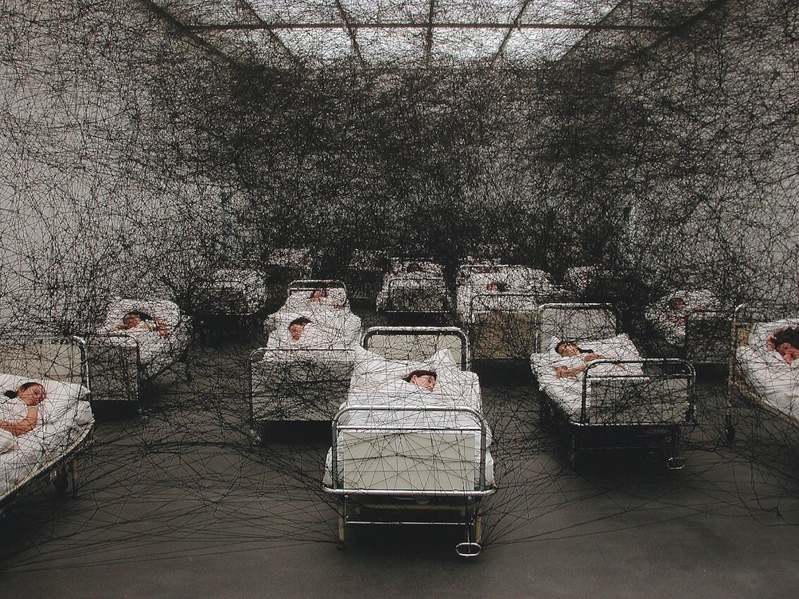 Тихару Сиота — современная японская художница, работающая в жанре инсталляции и перформанса. Множество работ художницы исполнены с помощью пряжи, которой она заполняет пространство, спутывая её между собой. По словам художницы, её работы основываются на ночных кошмарах, которые преследуют её на протяжение всей жизни. Сам материал, иногда, обозначает невидимую связь человека и предмета... ... Иногда, символизирует сложную сеть нейронных связей головного мозга, внутреннюю работу нашей психики.... ... Иногда кровеносные сосуды... ..... Иногда в прямом смысле..... Художница не настаивает на каком то конкретном смысле своих работ, оставляя свободу интерпретации зрителю. Нить не является единственным инструментом выражения Тихару Сиоты. Гигантские платья ещё один из главных и узнаваемых образов, ассоциируемых с Тихару Сиото. Финал III Московской биеннале, финалом которой стало сжигание рояля. До этого он был полноценной частью инсталляции . Так же существует нескольк
