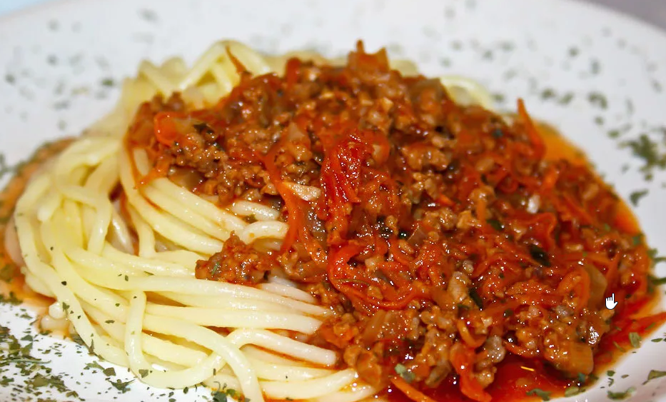500 г томатов в собственном соку Посмотрев глупый итальянский сериал решила приготовить что нибудь"как в кино". Выбор продуктов был ограничен только моей ленью,поэтому начала готовить из того что попалось под ручки) Когда смотришь как едят по телевизору люди,хочется сразу безумно есть. Берем любой мясной фарш(у меня говяжий). Слегка обжариваем на сковородке,затем добавляем мелко рубленный чеснок с лучком. Готовим около 25 минут. Добавляем к этому чуду томаты или томатную пасту и оставляем потомиться минут на 10. Подаем вместе с макаронами или спагетти,пастой. Получилось просто до безобразия и вкусно!