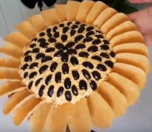 Очень красочная подача этого салата позволяет привести в восторг ваших родных и гостей. Ингредиенты Приготовление Отварную куриную грудку режем на небольшие кубики (можно полосками). Солим, перчим и делаем майонезную сетку. Вторым слоем выкладываем поджаренные шампиньоны и делаем майонезную сетку. Третьим слоем выкладываем яичные белки , натертые на крупной тёрке. Добавляем перец , соль и делаем майонезную сетку. Выкладываем потертый сыр и также делаем майонезную стеку. Завершающий слой делаем , потертыми на крупной терке, яичными желтками. Режем маслины вдоль пополам и раскладываем, как семена подсолнуха. Чипсами делаем лепестки. Вместо поджаренных шампиньонов можно взять консервированные. Приятного аппетита!