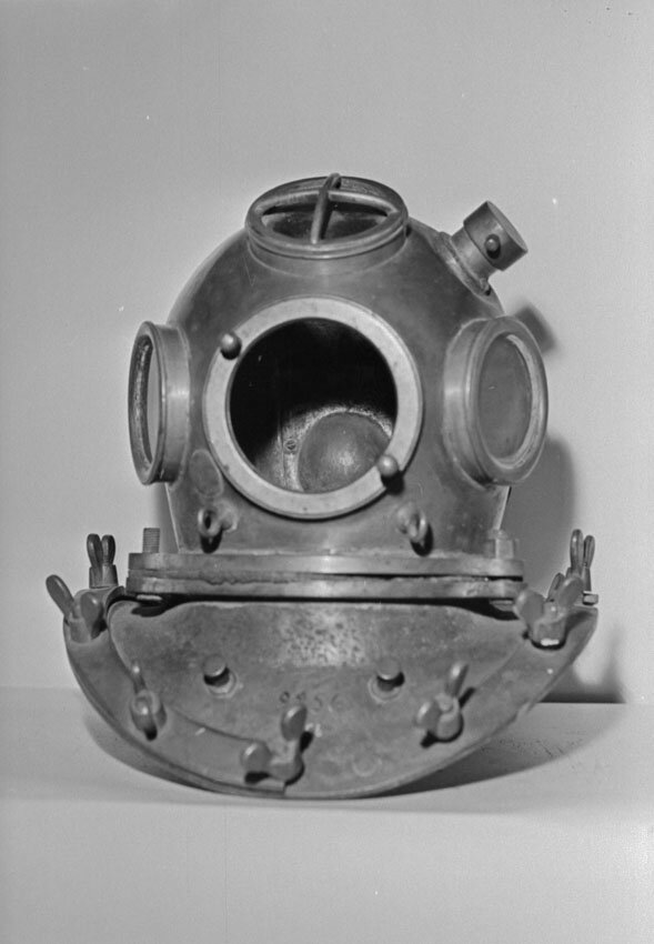 Водолазные шлемы и ботинки , коллекция военно-морского музея. К сожалению , осталось только "верх и низ" , а сами костюмы сгнили от времени - нет у музейщиков технологий их консервации.