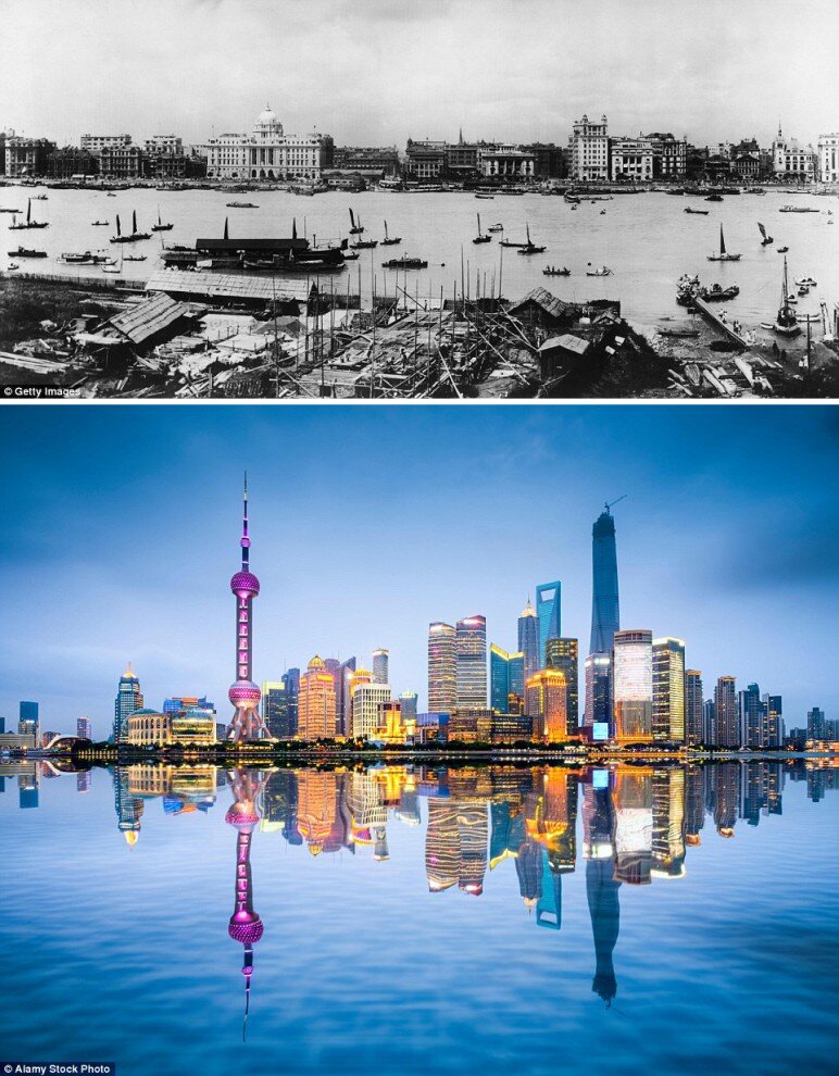 На фото внизу: узнаваемая архитектура современного Шанхая, в том числе телебашня «Восточная жемчужина». На фото вверху: город Кэйдзё (современный Сеул) в 1900 году. На фото внизу: Сеул в наши дни. Горы на заднем плане – единственное, что осталось неизменным за последние 116 лет. На фото вверху: Токио после американских бомбардировок 9 марта 1945 года во времена Второй мировой войны.