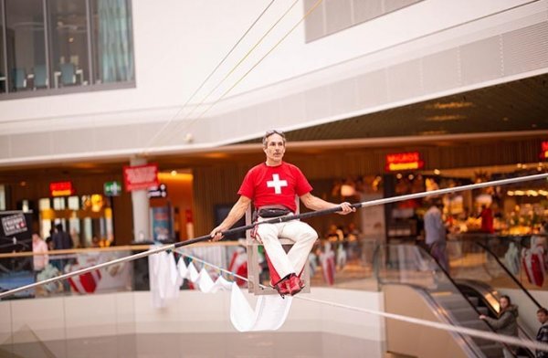 Каскадер Фредди Нок появился в Эбиконе (Швейцария) на празднование годовщины местного торгового центра вовсе не для того, чтобы сделать покупки. Талантливый канатоходец выбрал это место, чтобы не только продемонстрировать посетителям свое уникальное мастерство, но и установил мировой рекорд.