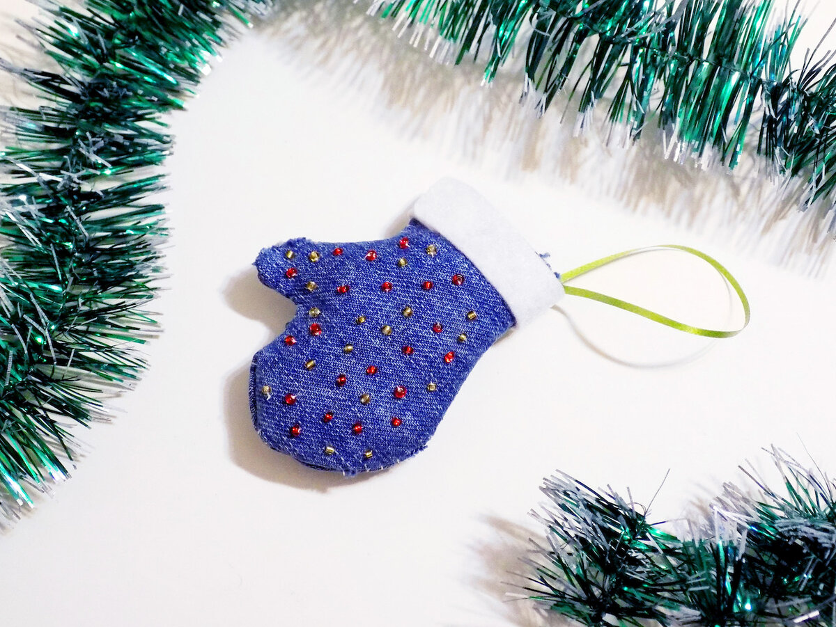 Весьма популярны последнее время елочные игрушки ручной работы. Они красиво смотрятся на елке, при этом оставаясь оригинальным украшением. Ведь дубликатов у таких, наверняка, нигде нет. Один из символов Нового года – варежка Деда Мороза. Ее часто выполняют из ткани или фетра. Если же необходимо нечто максимально уникальное, можно сшить елочную игрушку из джинсовой ткани, например, из старых джинсов. Такую варежку можно повесить на елку или использовать для основы новогодней декоративной композиции. Материалы: • бисер (красный, желтый); • нитки; • фетр искусственный (белый); • синтепон; • декоративная лента; • джинсовый лоскуток. Инструкции по созданию елочной игрушки Размеры игрушки выбираем произвольно, но от них будет зависеть, сколько джинсовой ткани нам необходимо. Если лоскуток имеется в наличии совсем небольшой, можно сделать миниатюрную елочную игрушку. Рисуем на изнаночной стороне джинсовой ткани варежку. Затем вторую такую же, но зеркально отраженную. Вырезаем две половинки е