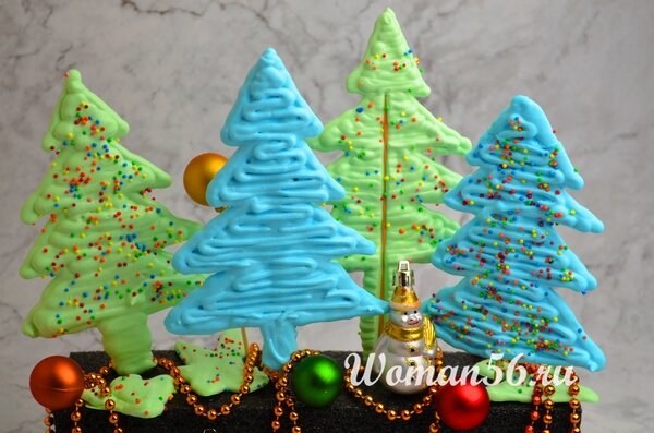 Аналогично рисуют голубые елочки. Лотки ставят ярусами в электросушилку. Меренги нужно сушить в течение 24 часов. Высушенные цветные меренги в виде елочек легко снимаются с бумаги, а в недосушенном состоянии они остаются липкими.