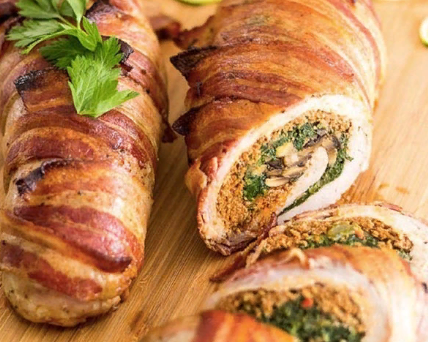 Доброго дня дорогие читатели, хочу поделиться с вам рецептом вкусного мясного рулета с начинкой в беконе. Свиная лопатка 1300 грамм Бекон сырокопченый 250 грамм Тыква- 200 грамм Сушеный тимьян 2 ч.л. Шампиньоны 5 больших Масло сливочное 50 грамм Укроп - большой пучок Грецкий орех 200 грамм Соль и специи по вкусу Для начала займемся начинкой, для этого очищаем тыкву от кожуры и семян. Затем нарезаем небольшими кубиками. Которые солим и приправляем сушеным тимьяном. Обжариваем до мягкости. А после давим в подобие пюре. Шампиньоны мелко нарезаем и обжариваем до золотистости, орехи прогреем на сковороде а после перемалываем в блендере. Саму же лопатку мы должны привести в вид прямоугольника, чем ровнее тем лучше. Теперь же выкладываем на наше мясо начинку, не забудьте добавить рубленый укроп. После чего выложим на укроп масло сливочное, и сворачиваем рулет и закрываем все мясо беконом. После чего закрепляем зубочистками нашу ровную колбаску. Запекаем под фольгой 50 минут, а затем без не