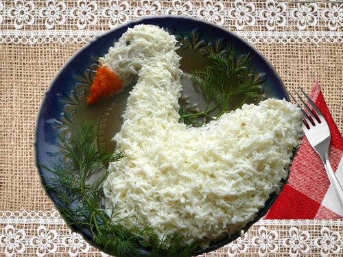 Красивый и вкусный праздничный салат с грибами, чесноком и сыром в виде пушистого белого гуся. Для приготовления этого салата лучше брать большую плоскую тарелку.