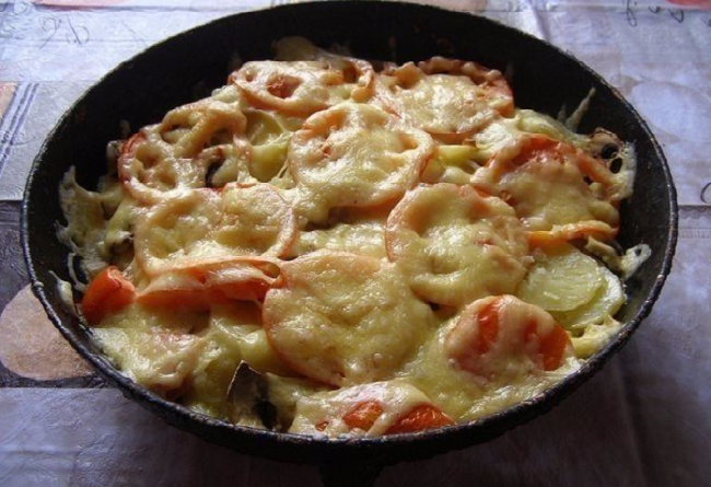 Очень вкусная овощная запеканка! Состоит она из самых простых овощей, которые наверняка всегда имеются в достаточном количестве в любом доме + немного грибов. Грибочки конечно лучше брать белые, но за неимением таковых, я прекрасно обхожусь шампиньонами. Получается очень вкусно и сытно! Так что если вы не знаете чтобы такого приготовить на обед или ужин, что называется "из ничего", то бишь из того что есть здесь и сейчас, тогда смело беритесь за овощную запеканку, уверен, ваши домочадцы останутся довольны. Да и вы тоже, поскольку приготовить ее не составит большого труда и в материальном плане тоже получается не накладно) В общем, с какой стороны не посмотри - одни "плюсы") Нам понадобится: 6-7 картофелин 150 грамм шампиньонов пара небольших луковиц грамм 200 твердого сыра 1-2 помидора зубчик чеснока по 2 столовых ложки майонеза и сметаны соль, перец - по вкусу немного подсолнечного масла. Кстати, о вкусной и здоровой еде можно прочитать здесь: Необычные гренки из лаваша - быст