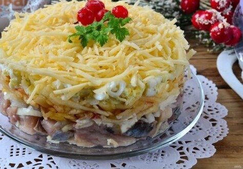 Ингредиенты, которые нам потребуются: Сельдь — 1/2 Штуки Яйца — 2 Штуки Лимон — 1/2 Штуки Майонез — 100 Миллилитров Яблоко — 1/2 Штуки Сыр твердый — 75 Грамм Лук репчатый — 1/2 Штуки Сахар — 1 Чайная ложка (для маринада) Соль — 1 Щепотка (для маринада) Вода — 75 Миллилитров (для маринада) Уксус столовый 9% — 75 Миллилитров (для маринада) Процесс приготовления: Начинаем с подготовки продуктов для салата. Чистим небольшую луковицу, мелко нарезаем её. С сельди снимаем шкурку, очищаем от всех костей и мелко нарезаем мясо. Если у вас готовое филе, это значительно упрощает задачу и уменьшает время приготовления салата. Теперь маринуем лук, чтобы он не горчил, а вкус его был мягким. В ёмкости смешиваем воду, уксус и соль с сахаром. Добавляем уже мелко нарезанный лук и минут на 15 оставляем его. Яйца отвариваем вкрутую, отставляем охлаждаться. Замаринованный лук отжимаем, маринад можно сливать, он больше не понадобится. Салат будем делать слоями, поэтому выкладывать ингредиенты можно как в о